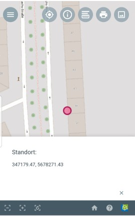 Für die Nutzung auf mobilen Geräten im Gelände wurde das Werkzeug „Mein Standort“ hinzugefügt. Per Klick springt die Karte zur aktuellen Position des Anwenders in der Karte und zeigt die X- und Y-Koordinaten an.